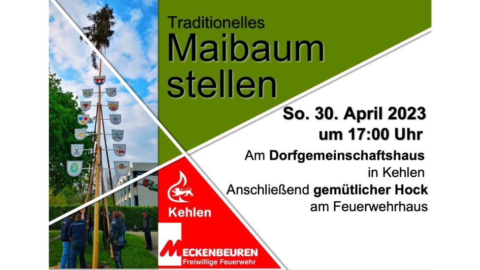 18.04.2023 Maibaumstellen Kehlen 202318.04.2023Am 30. April 2023 um 17 Uhr findet wieder das traditionelle Maibaumstellen vor dem Dorfgemeinschaftshaus in Kehlen statt. Im Anschluss gibt es einen „gemütlichen Hock“ am Feuerwehrhaus in Kehlen. Wir freuen uns auf Ihren Besuch!Mehr