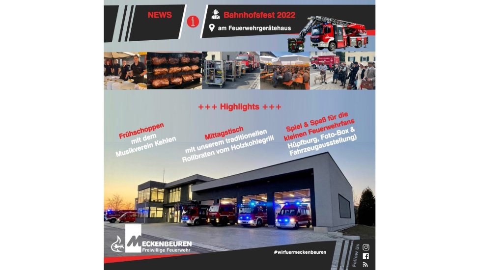 17.08.2022 Bahnhofsfest 28.08.202217.08.2022Am Sonntag, den 28. August 2022 findet wieder das traditionelle Bahnhofsfest in Meckenbeuren statt. Schauen Sie bei uns vorbei - die Feuerwehr Meckenbeuren freut sich auf ihren Besuch!Unsere Highlights: Frühschoppen mit dem Musikverein Kehlen / Rollbraten vom Holzkohlegrill mit Pommes oder …Mehr
