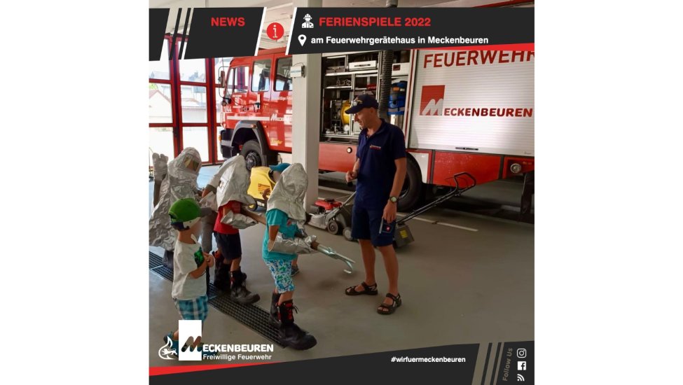 15.08.2022 Ferienspiele 2022 - Ein Tag bei der Feuerwehr Meckenbeuren15.08.2022Am vergangenen Freitag fanden wieder die Ferienspiele bei der Feuerwehr Meckenbeuren statt. Hier war Einiges geboten für die heranwachsenden Feuerwehrfrauen und Feuerwehrmänner. Die verschiedenen Stationen wie bspw. Brandschutzerziehung, Drehleiterfahrt, Feuerwehrfahrzeugrennen oder eine Rundfahrt …Mehr