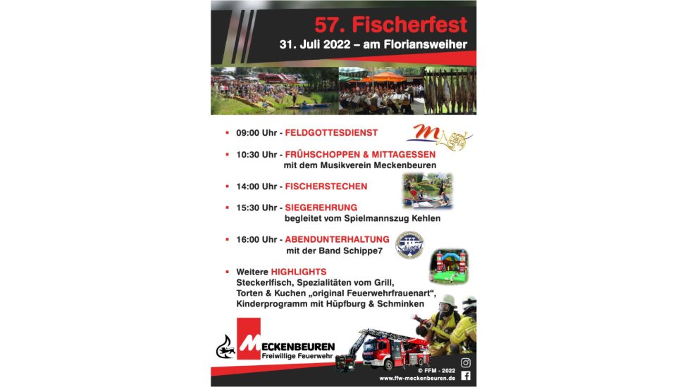 05.07.2022 Fischerfest 31.07.202205.07.2022Anbei haben wir noch ein paar Impressionen vom diesjährigen Fischerfest, welches zahlreiche Besucher (ob Groß oder Klein) anlockte. Leider konnte das Fischerstechen aufgrund des geringen Wasserstandes dieses Jahr nicht stattfinden. Die Feuerwehr Meckenbeuren freut sich auf das nächste Fischerfest in …Mehr