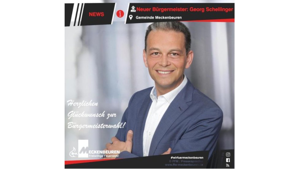 16.05.2022 Herzlichen Glückwunsch zur Bürgermeisterwahl16.05.2022Die Feuerwehr Meckenbeuren gratuliert recht herzlich Herrn Georg Schellinger zur gewonnenen Bürgermeisterwahl. Für das verantwortungsvolle Amt wünschen wir viel Erfolg, Inspiration, Weitsicht und stets das richtige Quäntchen Glück.Mehr
